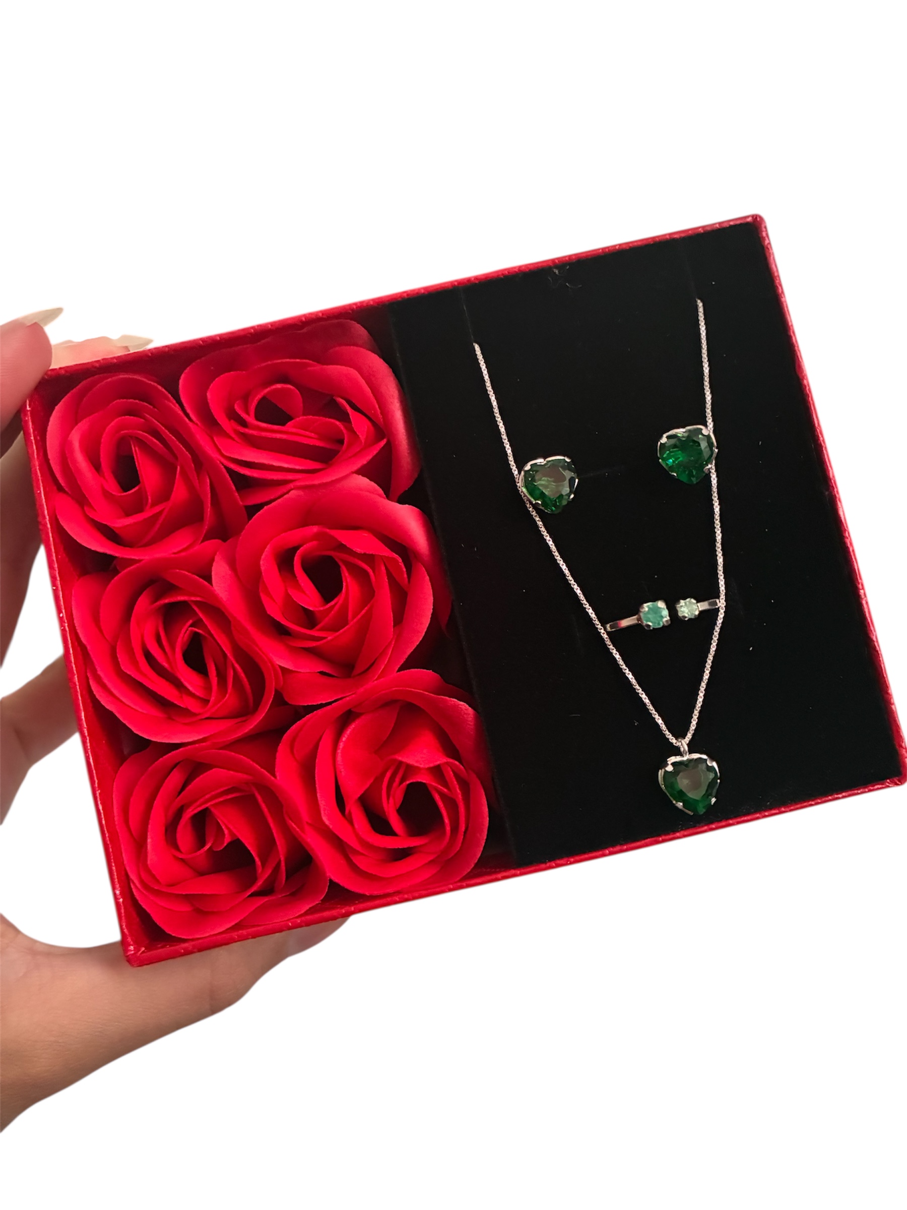 Caixa com Conjunto Colar e Brinco de Coração e anel em Prata 925